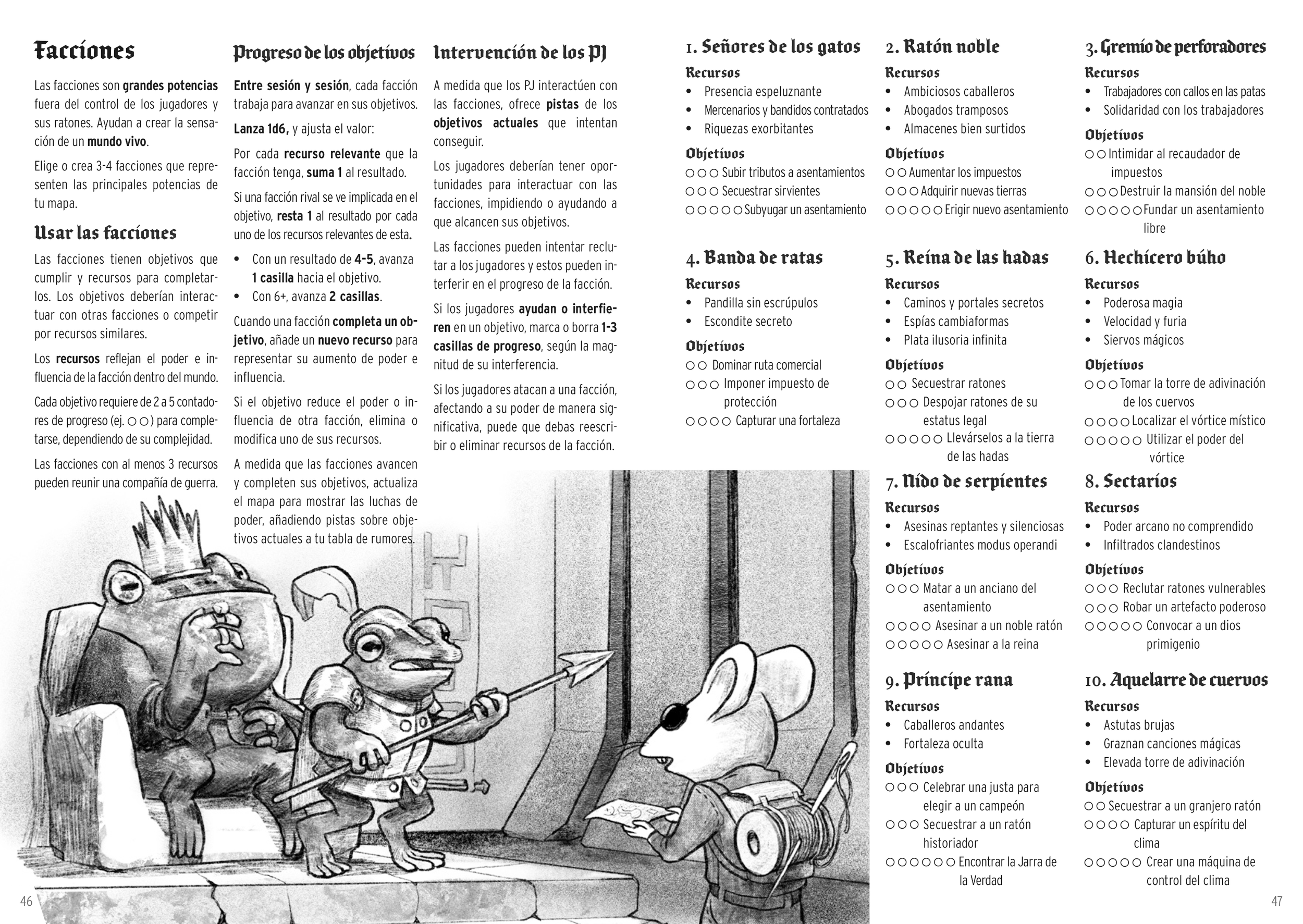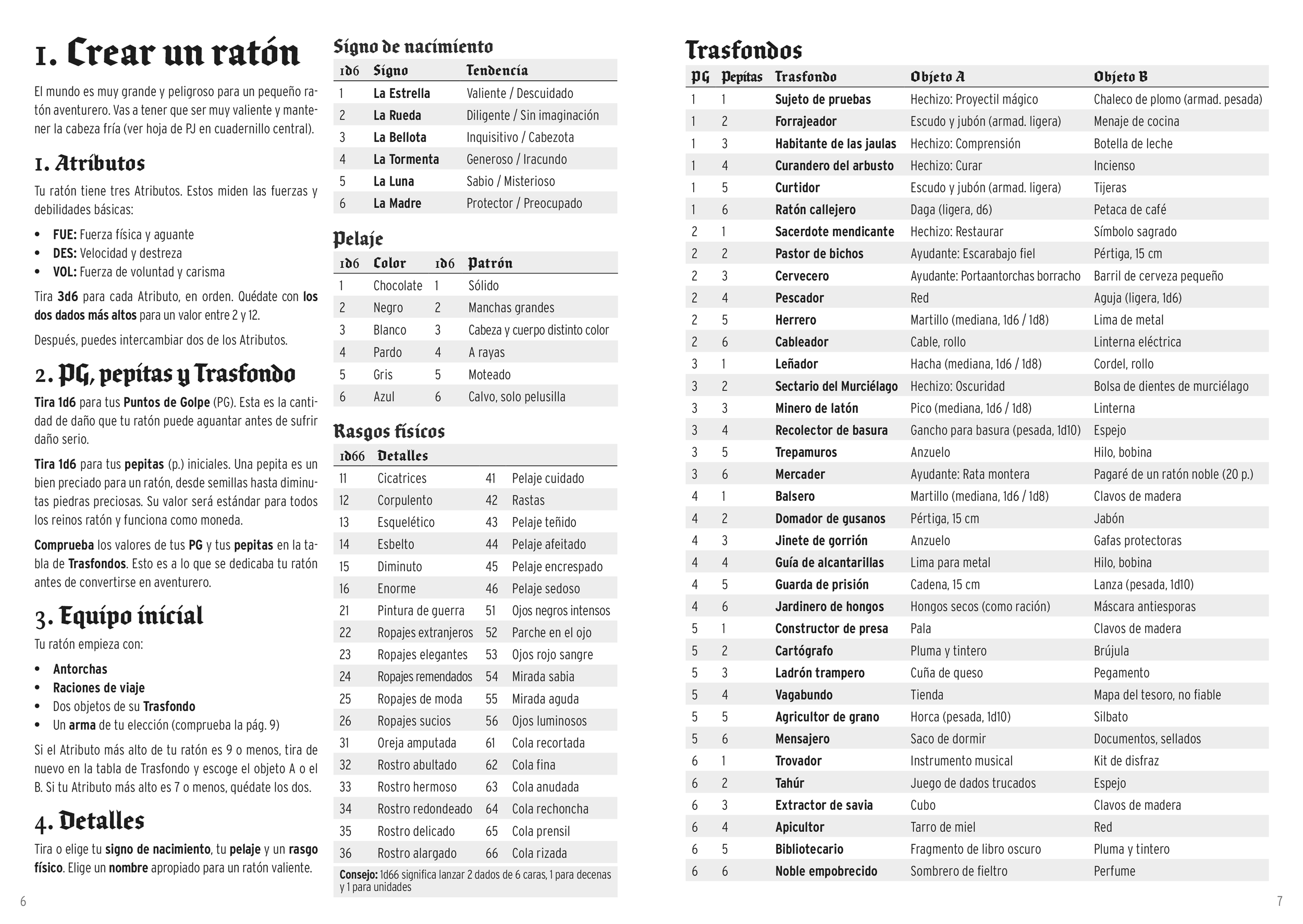 Las reglas son minimalistas, inspiradas en el OSR. Cuenta con un sugerente método de gestión del inventario y los estados de los ratones protagonistas y sus ayudantes; los conflictos y desafíos se resuelven con tiradas de salvación; la mecánica de generación de personajes es rápida e intuitiva; los hechizos son espíritus vivientes atrapados por runas grabadas en tablillas de obsidiana; el Director de juego encontrará una gran cantidad de recursos y ayudas para generar historias: facciones, criaturas, semillas de aventura, etc.; además de numerosas tablas para inspirarse o improvisar situaciones con tiradas aleatorias, y herramientas para crear desde una habitación hasta un mapa hexagonal con las zonas de aventura que recorrerán los jugadores en su exploración de los reinos ratón. Incluye un detallado mapa de aventuras y un escenario listo para jugar.