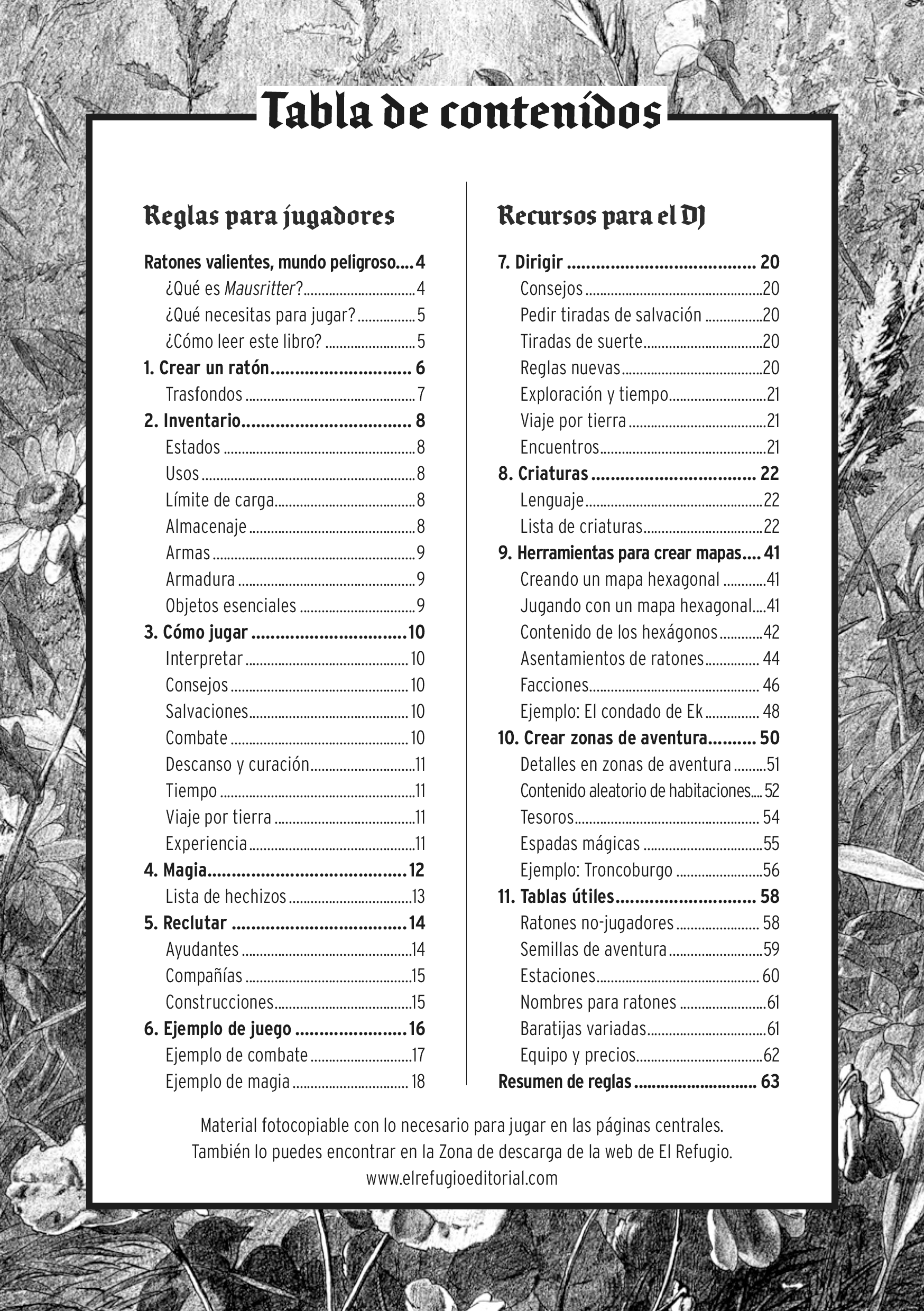 Mausritter contiene: Manual de reglas, la Pantalla del Director de juego (¡Es la sobrecubierta!) y Material fotocopiable: Hojas de personaje y ayudantes, hoja de seguimiento para el Director de Juego, tarjetas recortables de inventario y estados de los personajes, una plantilla hexagonal para crear tu zona de aventuras. También puedes descargar este material en la zona de descarga.